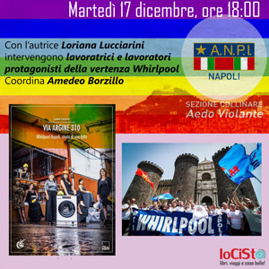 Per il ciclo di appuntamenti mensili Memoria attiva organizzati da ANPI Collinare Aedo Violante insieme alla nostra libreria, martedì 17 dicembre alcuni lavoratori e lavoratrici protagonisti della vertenza Whirlpool affronteranno insieme alla scrittrice Loriana Lucciarini, autrice del libro Via Argine 310, tutte le problematiche che subentrano quando si rischia la perdita del posto di lavoro e di come una vertenza tanto lunga e articolata possa cambiare la vita stessa delle persone. Verranno anche proiettati alcuni spezzoni del film-documentario di Gianfranco Pannone Via Argine, 310.